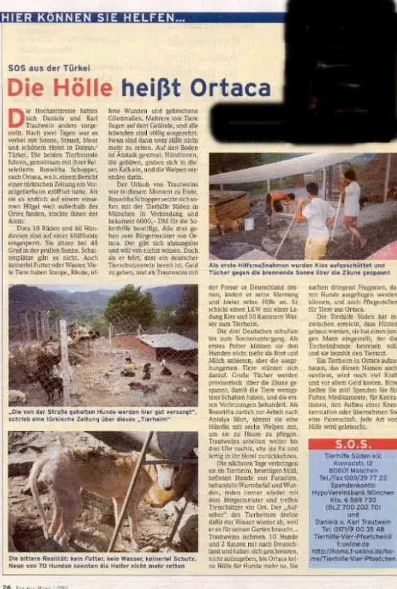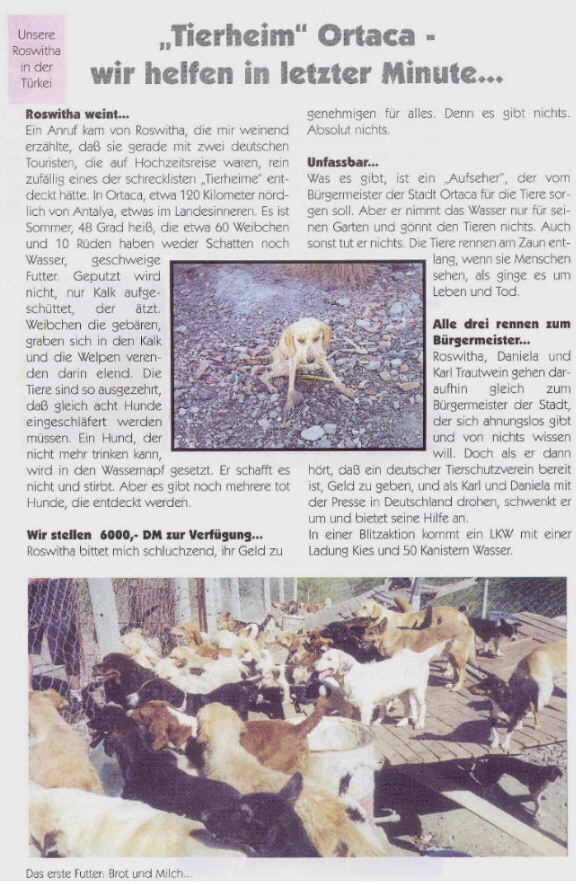 Artikel in der Vereinszeitschrift der "Tierhilfe Süden", Ausgabe Herbst/Winter 2000/2001 "Tierheim Ortaca - Wir helfen in letzter Minute"
